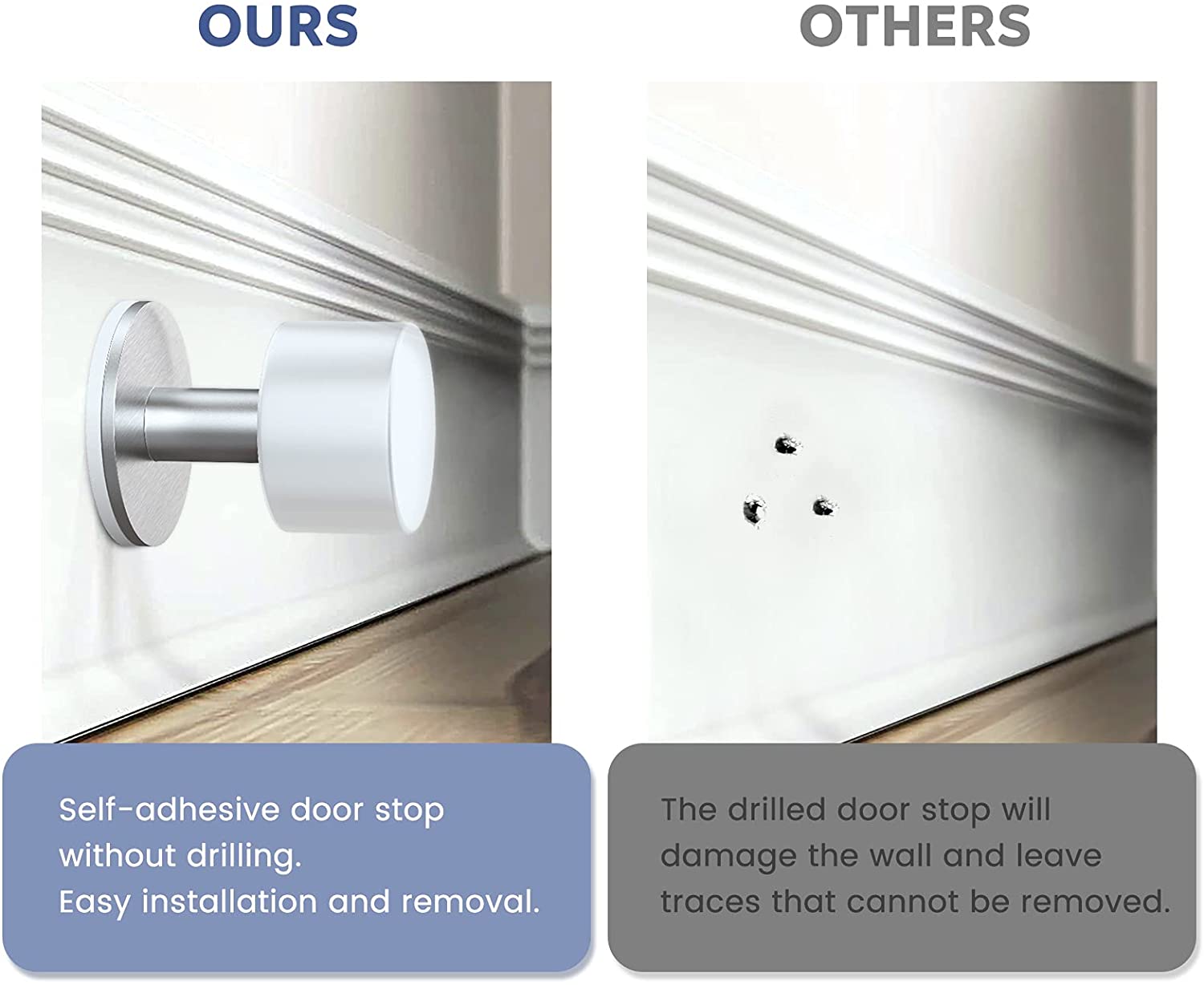 - 【No Need to Drill】The self adhesive door stop was easy to fit and sticks well and looks stylish.Just remove the 3M VHB adhesive stickers at the bottom, and then paste it on any wall or furniture. Without the need to damage wall or furniture with screws and it is very sturdy.